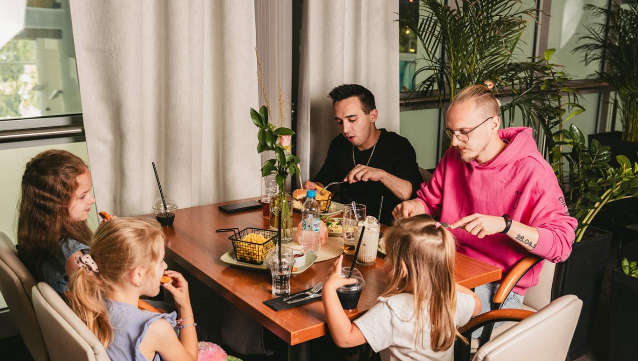 - restauracja serwująca domową kuchnię z widokiem na strefę basenową.